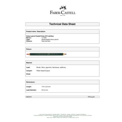 Matita con mina bicolore Castell Color 873, rossa e blu. Sezione esagonale Jumbo laccata con vernice a base d'acqua. Il sistema brevettato SV protegge la mina dalla rottura.