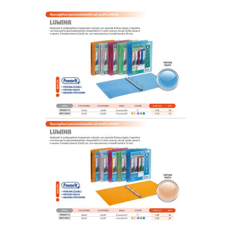 Raccoglitori personalizzabili ad anelli Lumina, realizzati in polipropilene trasparente colorato con speciale finitura rigata. Copertina con tasca per la personalizzazione. Meccanismo a 4 anelli tondi diametro 15 mm. Formato interno 22x30 cm. Colori assortiti: arancio, fucsia, verde, azzurro e neutro.