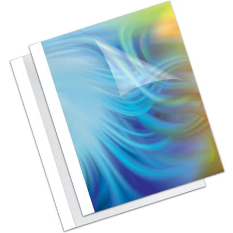 Termocopertina con fronte in PVC trasparente, grammatura 150, spessore 1,5 mm e retro in cartoncino goffrato da 200 gr. Confezione da 100 pezzi.