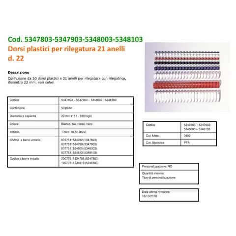 - Altre caratteristiche: Idonei per uso con ogni rilegatrice a dorso plastico a 21 fori. Passo 9/16'' - 14,28 mm. Per rilegare dalle 151 alle 180 pagine.