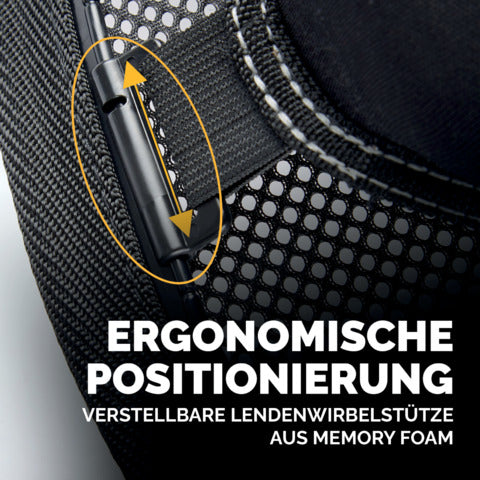 Supporto per la schiena in tessuto a rete con inserti di rinforzo, si adatta alla forma del tuo corpo. Supporto lombare regolabile verticalmente in memory foam. Sistema di ancoraggio Tri-tensioning™ che tiene il supporto in posizione eliminando la necessità di continui aggiustamenti. Il tessuto a rete permette il passaggio dell'aria per una seduta confortevole. Si adatta facilmente a ogni tipo di sedia. Colore: nero.