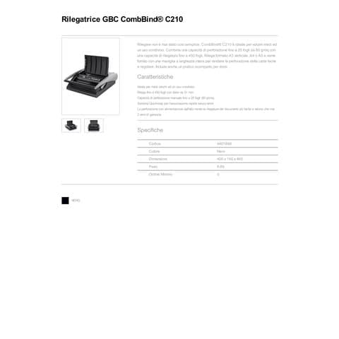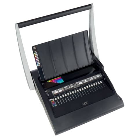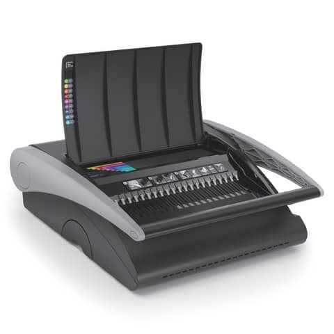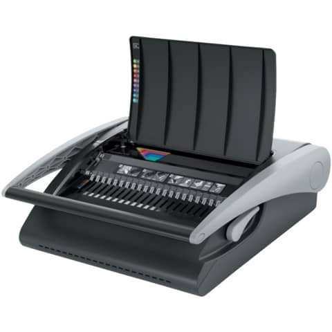 Rilegare non è mai stato così semplice. CombBind® C210 è ideale per volumi medi ed un uso condiviso. Combina una capacità di perforazione fino a 25 fogli da 80 g/mq con una capacità di rilegatura fino a 450 fogli. Rilega formato A3 verticale, A4 o A5 e viene fornito con una maniglia lungo l'intera larghezza per rendere la perforazione della carta facile e regolare. Include anche un pratico scomparto per dorsi CombBind®, il sistema classico per rilegare. Garanzia 2anni. Dimensioni LxPxH: 40x46,5x14,5 cm.