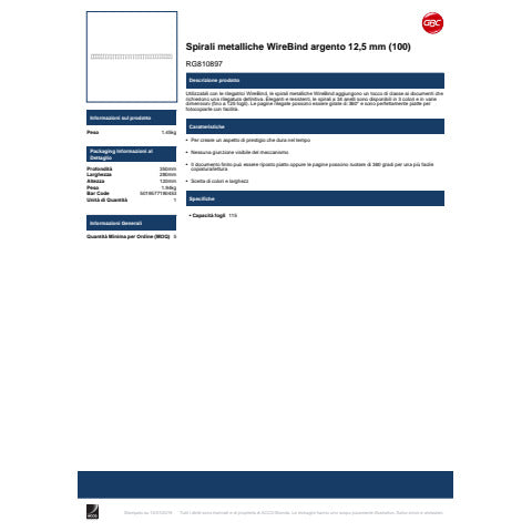 Rilegare non è mai stato così semplice! Utilizzabili con le rilegatrici WireBind, le spirali metalliche WireBind aggiungono un tocco di classe ai documenti che richiedono una rilegatura definitiva. Le pagine rilegate possono essere girate di 360° e sono perfettamente piatte per fotocopiarle con facilità. 12,5 mm, 34 dorsi ad anelli. Rilega fino a 115 fogli. Formato A4. Confezione da: 100.