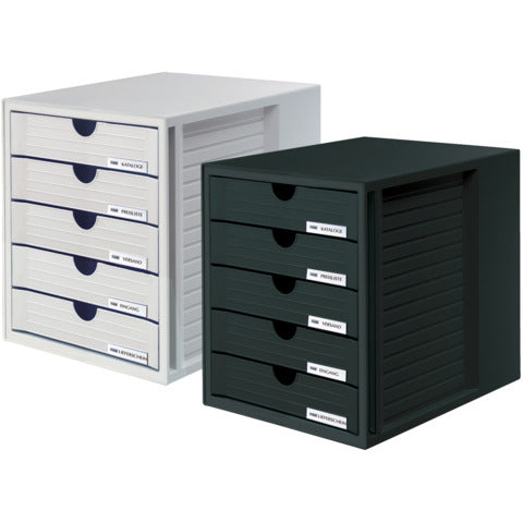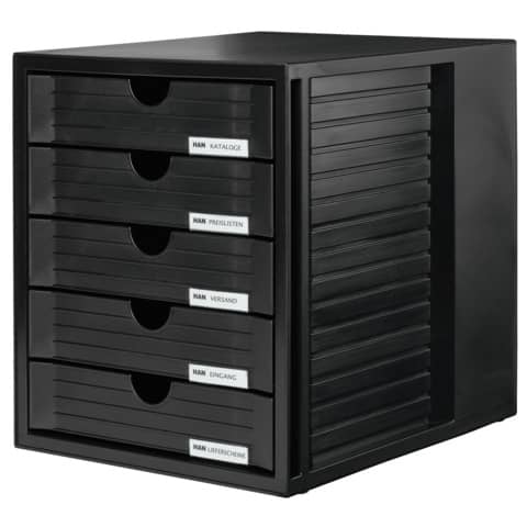 Cassettiera SYSTEM BOX con 5 cassetti chiusi. Incluso il clip porta-etichette (codice 1021). Per formati di carta DIN A4 e più grande. Design attuale, altissima qualità. Cassetti scorrevoli con fermo all’estrazione. Lavorazione robusta. Impilabili con piedini in gomma per proteggere i mobili ed aumentando la stabilità. Made in Germany. Misure esterne (L x P x H): 275 x 330 x 320 mm. Misure interne dei cassetti (L x P x H): 238 x 305 x 45 mm. Grande capienza. Materiale polistirolo (PS) di alta qualità. Colore involucro: nero. Colore cassetti: nero.Blu