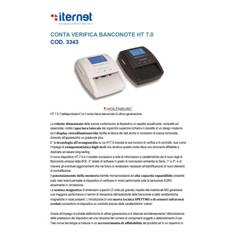 Conta verifica banconote di ultima generazione, dotato di tecnologia all’avanguardia e componentistica high-tech che conferiscono affidabilità e long-lasting. Il microprocessore di memoria ad alta capacità espandibile, la testina magnetica di dimensioni maggiori rispetto alle tradizionali, la nuova tecnica di rilevazione “SPETTRO” e i sensori infrarossi evoluti consentono di verificare le banconote in modo performante e preciso. Valute: Euro e Sterlina Inglese. Controlli: IR, MG, DD, SPETTRO, QUALITA’ DELLA CARTA. Uscita delle banconote selezionabile frontale o posteriore. Allarme visivo e sonoro per banconote sospette. Report e importo totale a display. Software aggiornabile. Dimensioni: 137x117x62 mm. Peso: 0,46 Kg(senza batteria). Alimentazione: rete elettrica (alimentatore incluso) o batteria ricaricabile (opzionale). Colore: nero.