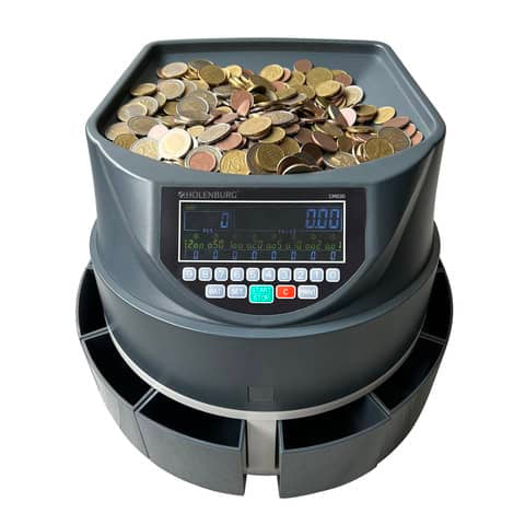 Conta dividi valorizza monete Euro a 8 cassetti dalle alte prestazioni professionali CM030 . Capacità di carico: 1000/1300 monete. Capacità dei cassetti 100/400 monete. Velocità di conteggio fino a 650 monete/minuto. Funzione batch (impostazione del numero di pezzi da conteggiare). Report di conteggio a display e stampabile. Dimensioni 330(D)x255(H) mm.