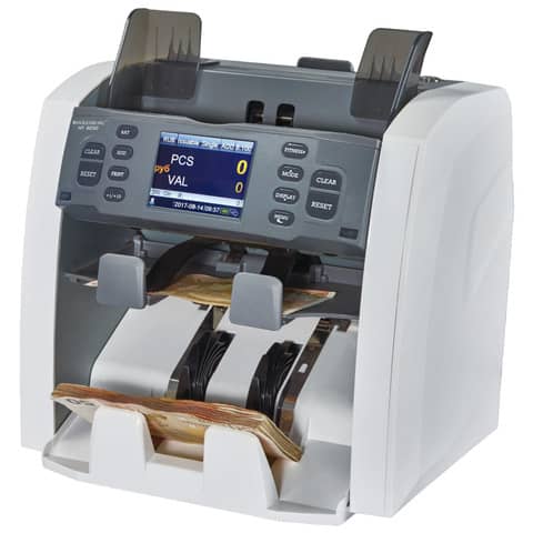 Selezionatrice multivaluta HT8030 grigia. Valute verificabili EURO, USD, GBP e CHF. Controlli: IR, MG, MT, UV. CIS, 3D, FLUORESCENZE, QUALITA' DELLA CARTA, VERIFICA DEL LOGORO. Velocità di conteggio 700/900/1.100 pz/minuto, in base alla modalità di verifica selezionata. Banconote in carico: 500. Banconote in raccolta: 200. Quantità massime banconote in cassetto reject: selezionabili 20/30/40/50. Funzione batch (impostazione numero di pezzi da conteggiare). Report conteggi e valorizzazione a display e stampabile. Software aggiornabile. Dimensioni: 243x287x248 mm. Alimentazione rete elettrica (cavo incluso).