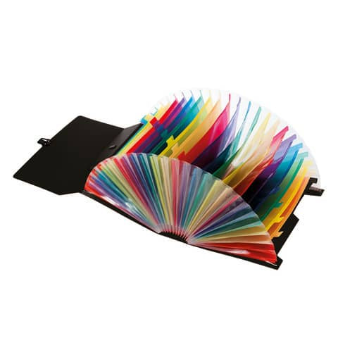 Portadocumenti 25 scomparti in robusto polipropilene, con portabiglietti da visita, f.to 33x24,5x8 cm. Colori assortiti blu, nero, rosso.