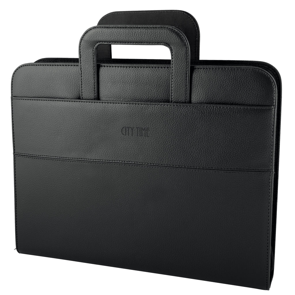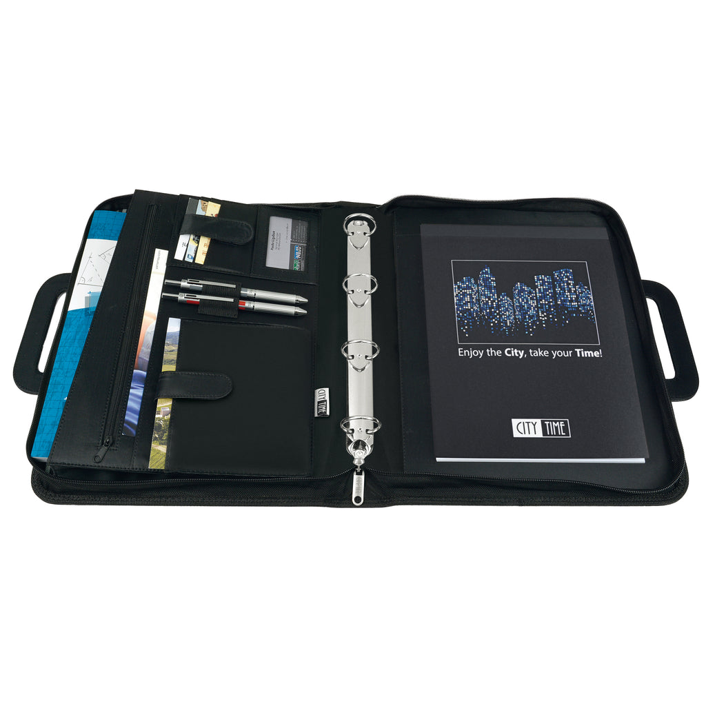 Portablocco in similpelle morbido colorato. Interno in tessuto a righe, chiusura con cerniera e dotato di manici rientranti. Varie tasche interne, 4 anelli metallici d3.5cm e completo di blocco.