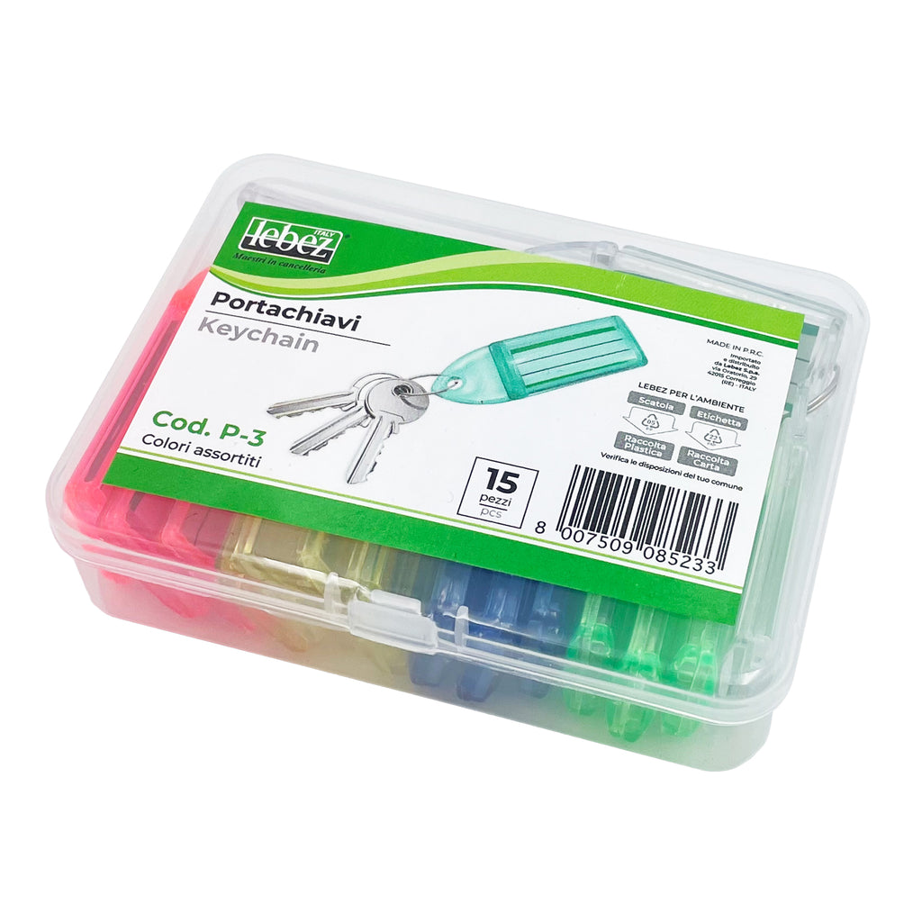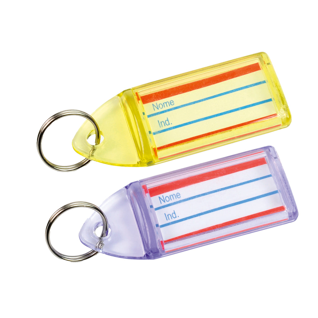 Targhette portachiavi in plastica con anello in metallo.