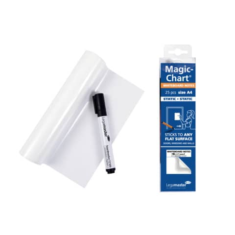 Gli innovativi fogli Legamaster Magic-Chart Whiteboard delle dimensioni di 20x 30 cm si avvalgono dell'elettricità statica per aderire a qualsiasi superficie piatta in modo da creare in un istante una superficie su cui scrivere. La nuova gamma di fogli in polipropilene è perfetta per dare libero sfogo alla creatività e per promuovere la comunicazione interattiva in qualunque ambiente professionale o didattico. Si incollano facilmente e senza problemi senza dover utilizzare la colla e sono adatti per l'uso con i marcatori permanenti. Perfetti per essere utilizzati al posto delle lavagne bianche, vengono forniti in un rotolo formato A4 da 25 fogli. -Aderiscono a qualsiasi superficie piatta - Aderenza totale, senza colla - Adatti per l'utilizzo con marcatori permanenti- Perfetti per essere utilizzati al posto delle lavagne bianche- Rotolo formato A4 da 25 fogli- Dimensioni: 20 x 30 cm- Colore: biancoA Quadretti