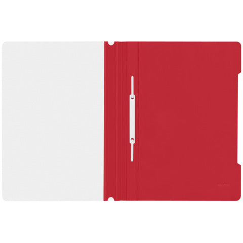 Cartellina con copertina trasparente in PVC. Etichetta longitudinale estraibile e ampia lunetta per facilitare l'apertura. Colore: rosso.