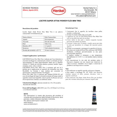 Rivoluzionario adesivo istantaneo gel, la cui formula rinforzata con microparticelle di gomma lo rende un adesivo adatto per tutte le superfici e specifico per i materiali flessibili come la gomma, il cuoio e la pelle. Resistente all’acqua, permette l’incollaggio di materiali porosi come legno e sughero grazie alla sua speciale formula in gel che non penetra, ma permea, non cola e non sbava, risultando ideale per applicazioni su superfici verticali. Speciale formato con 3 monodosi per avere il prodotto sempre fresco. LOCTITE® Power Mini Dosi è indicato per l’uso domestico e crea forti incollaggi tra i materiali più comuni. La formula gel anti-sgocciolamento lo rende particolarmente adatto per le superfici verticali. Resistente agli urti ed è perfetto per le applicazioni su materiali che richiedono una certa flessibilità. La formula è stata studiata per consentire di riposizionare i materiali durante l’incollaggio. Power Mini Dosi è conforme agli standard EN204 D3, nel caso di incollaggi del legno la formula resistente all’acqua rende la superficie interessata bagnabile, tuttavia perde di efficacia nel caso di un’esposizione continua a un ambiente umido. Velocità di incollaggio: adesione iniziale tra i 10 e 30 secondi a seconda del materiale. Forza dell’incollaggio: (ISO 4587), tra i 15 e i 25 N/mm2 in 12-24 ore a seconda del materiale.