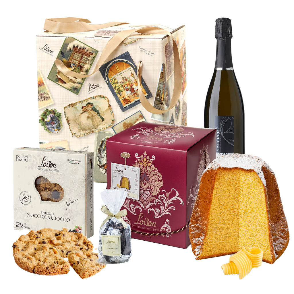 Scatola in cartoncino color indaco stampata a tema natalizio. Contiene: pandoro classico linea top foresta, 1kg sbrisola mandorla mais, con farina di mais marano e mandorle, in astuccio, 200gr amaretti misti morbidi, gusti mandorla e cappuccino, incartati singolarmente, in sacchetto regalo, 150gr tartufini, con cioccolato al latte in confezione regalo, 80gr bottiglia di vino spumante pinot brut nani castello di rubaro, 75cl