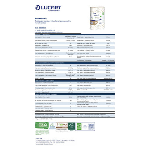 Carta igienica rotolino monofascettata in Fiberpack da 2 veli. Confezione da 6 rotoli da 170 strappi l'uno. Colore avana. Lunghezza rotolo: 18,7 m. Grammatura totale: 30 g/m². Diametro rotolo: 102 mm. Diametro anima: 45 mm. Dermatologicamente testato. Certificazioni: Ecolabel + FSC Recycled.