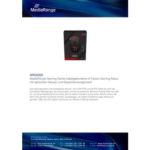 Un potente sensore ad alta precisione con 4.200 FPS e 48 IPS garantisce al mouse gaming GS200 prestazioni eccellenti. Frequenza di polling di 500 Hz e un tempo di risposta di 2 ms. Sistema di gestione del peso integrato con 5 pesi da 5 g, rotella di scorrimento extra-large e pulsanti aggiuntivi. Possibilità di passare da 400 a 4.200 dpi utilizzando i pulsanti DPI swith. Mouse cablato con 9 pulsanti, pulsante di fuoco e pulsante della modalità cecchino. Superficie rivestita in gomma e imbottitura laterale. Alimentazione USB, compatibile con Windows, Mac, Linux, Playstation, XBOX; Plug & Play. Dimensioni 124x80x38 mm.