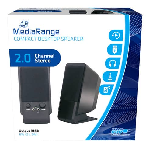Gli altoparlanti MediaRange sono perfetti per computer e notebook in ufficio oa casa. Compatti, controllo del volume, Jack 3,5 mm. On/off switch, output 2x3W, raggio di frequenza 180-20000 Hz. Colore nero.
