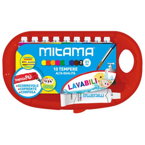 Colori a tempera superlavabili di alta qualità: più coprenti, più corposi, più scorrevoli. La confezione contiene 9 tubi da 10 ml in colori assortiti, 1 tubo bianco da 21 ml, 2 pennelli 4 mm e tavolozza per miscelare i colori.