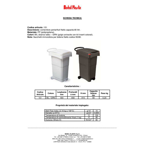 Contenitore portarifiuti Nello capacità 80 litri PP bianco latte. Larghezza: 400 mm. Profondità: 650 mm. Altezza: 810 mm. Peso: 5,4 Kg.