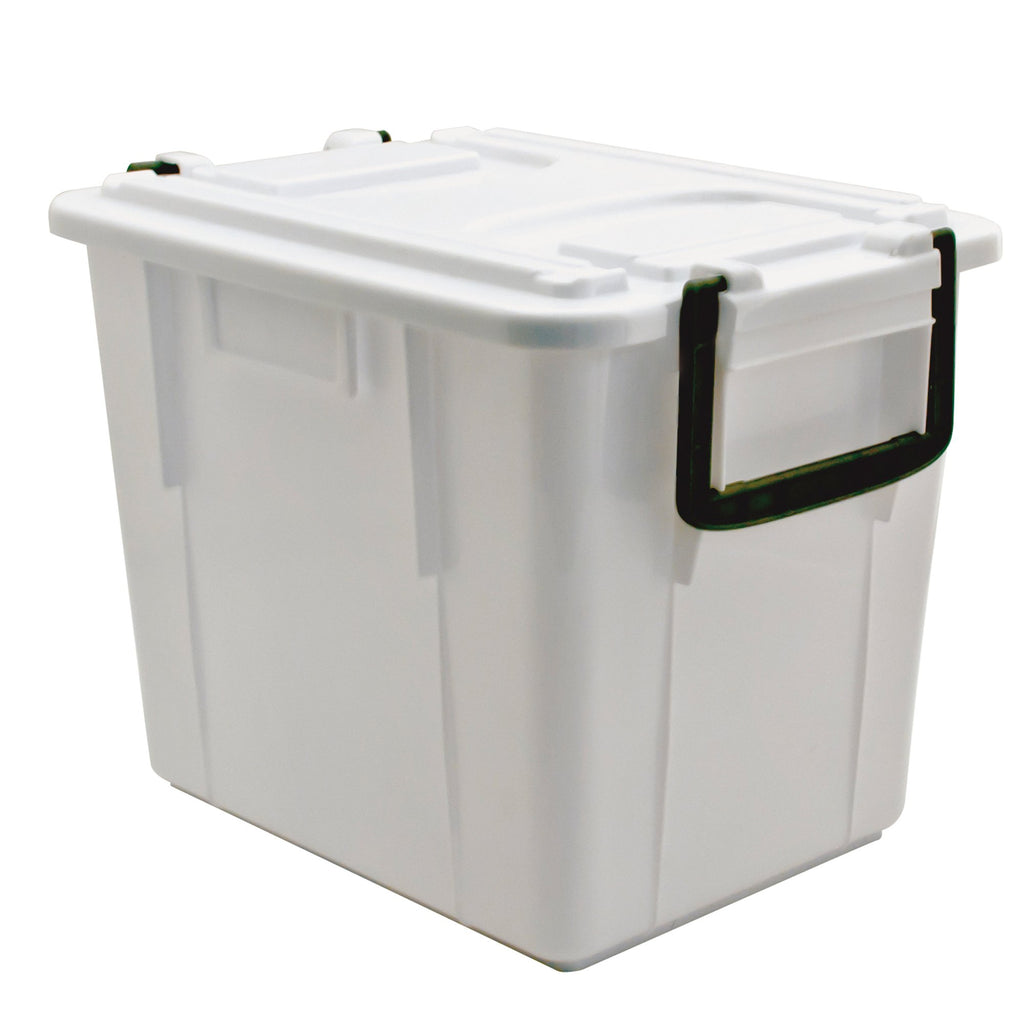 Contenitori food box con coperchio. In polipropilene riciclabile. I contenitori sono sovrapponibili con coperchio e impilabili senza coperchio. Dotati di manici. Idonei al contatto con alimenti. Colore bianco. Dimensioni: l38 x p28 x h30cm - 20 litri