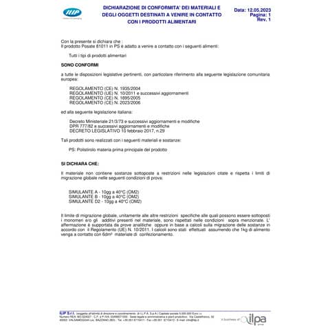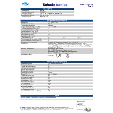 Coltelli in PS 3,8 g di colore trasparente. In confezione da 20 coltelli. Prodotto idoneo a contenere bevande alimentari a base acquosa, acida ed alcolica a temperatura ambiente o inferiore per periodi di tempo prolungati e alla temperatura massima di 70°C per tempi inferiori a 2 h e alla temperatura massima di 180°C per tempi inferiori a 15 min. Non utilizzare in forno o forno a microonde. Normative di riferimento 1935/2004/CE; D.M. 21/03/1973 e successivi aggiornamenti; Regolamento 10/2011/UE e successivi aggiornamenti; Direttiva 94/62/CE e successivi aggiornamenti.