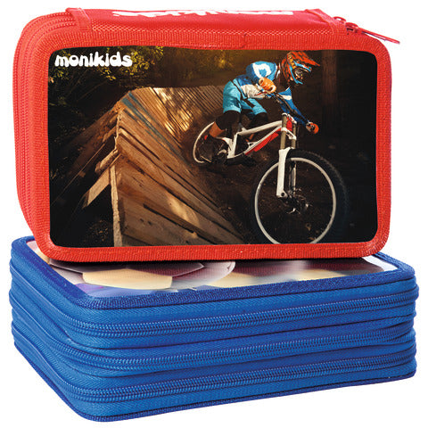 Astuccio a 3 cerniere con soggetti assortiti BOYS. Contenuto: 18 pastelli Giotto laccati, 18 pennarelli Giotto TurboColor, 1 temperamatite, 1 righello, 1 gomma, 1 matita HB/2, 3 penne (nera, rossa e blu), 1 forbice, 1 calendario scolastico. Misura 20,5x13x6 cm.