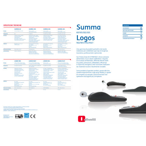 La linea delle calcolatrici professionali Olivetti ECO FRIENDLY non contiene sostanze nocive alla salute ed è composta ad plastica riciclata e riciclabile più volte. Display retroilluminato a 12 grandi cifre, si spegne automaticamente dopo 3 minuti di inattività, mantiene i calcoli in memoria. Sistema di stampa con inchiostro a due colori. Funzioni complesse e logica calcolo GT. Ttastiera antisettica contro la diffusione dei batteri, muffe e microrganismi. Alimentazione a rete. Dimensioni LxPxH: 205x310x80 mm.