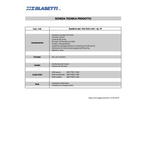 Blocco spiralato laterale in cartoncino A5, fogli microperforati, carta da 80 gr e risguardo 60 fogli. Misura 16,2x21cm.