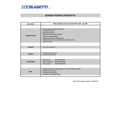 Maxi quaderno spiralato One Color Blasetti da 80+1 fogli in formato A4. Carta da 80 g e copertina in PPL, con rigatura a quadretti 4M.