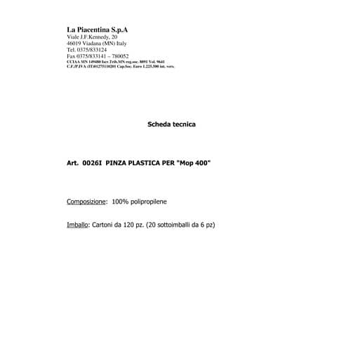 Pinza di supporto per mop a frange in cotone gr. 400 (art. 0026H) e mop in viscosa gr. 260 (art. 0024G).