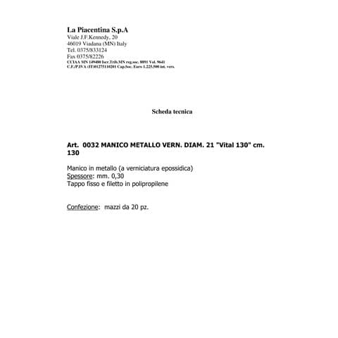 Manico Vital in metallo verniciato cm. 130 diam. 21, vite italiana, per scope e spazzettone pavimenti. Compatibile con i Mop Perfetto 100809-100810-100811. Compatibile con le scope 100781, 100782, 100783, 100784, 100785.