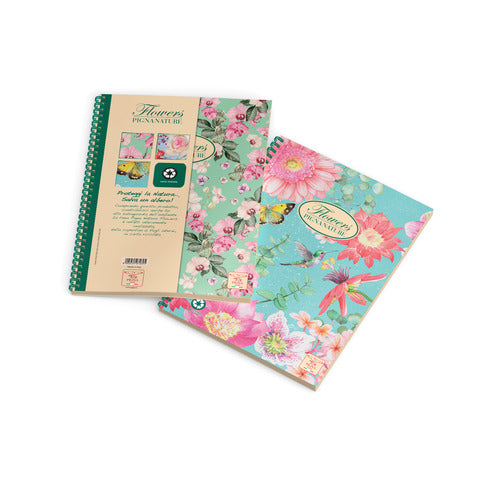 Blocco A4 Spiralato Pigna Nature Flowers in carta riciclata con 4 fori e microperforazione. Rigatura T5: quadretto 5 mm con cornice. Numero fogli: 120. Peso g/mq: 80. Formato: 22,5 x 29,7 cm.