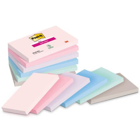 Blocchetti da 90 foglietti Post-it® Super Sticky con adesivo rinforzato che si attacca praticamente su tutte le superfici senza lasciare traccia. Nuovissimo assortimento a tema Soulful: rosa sale, rosa fenicottero, lavanda, blu jeans, verde menta fresca e grigio pietra. Formato 76x127 mm, contenuto 6 blocchetti da 90 fogli cadauno.
