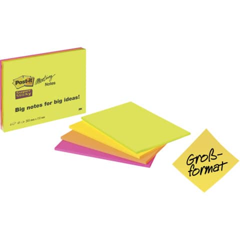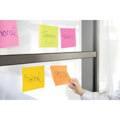 Post it® Super Sticky Meeting Notes, lo strumento perfetto per sessioni di brainstorming produttive e creative e la pianificazione di riunioni. Sono extra large e super adesivi, quindi potrete catturare le idee e raggrupparle all'interno della stanza.