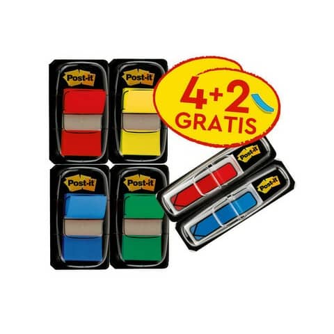 Segnapagina in formato medium, autoadesivi e removibili. Essenziali per contrassegnare e codificare con i colori i documenti. I segnapagina colorati Post-it® Index attirano subito l'attenzione grazie al colore e presentano una superficie scrivibile per la scrittura delle note o delle intestazioni. Riposizionabili e scrivibili, migliorano l'organizzazione del lavoro. Ogni confezione contiene 200 segnapagina (4 dispenser da 50 segnapagina) di dimensioni 25,4x43,6 mm e da 48 mini frecce (2 dispenser x 24 mini frecce). Confezione promozionale da 4 dispenser Post-it® 680 + 2 dispenser Post-it® Mini 684 Freccia GRATIS.