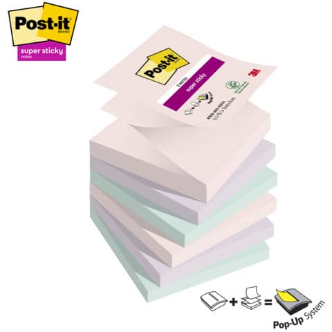 Foglietti Post-it® Super Sticky Z-Notes Soulful in blocchetto di ricarica per dispenser. Colorazioni vivaci a tema con adesivo rinforzato. Formato 76x76 mm, contenuto 6 blocchetti da 90 fogli cadauno. Colori verde, rosa, viola