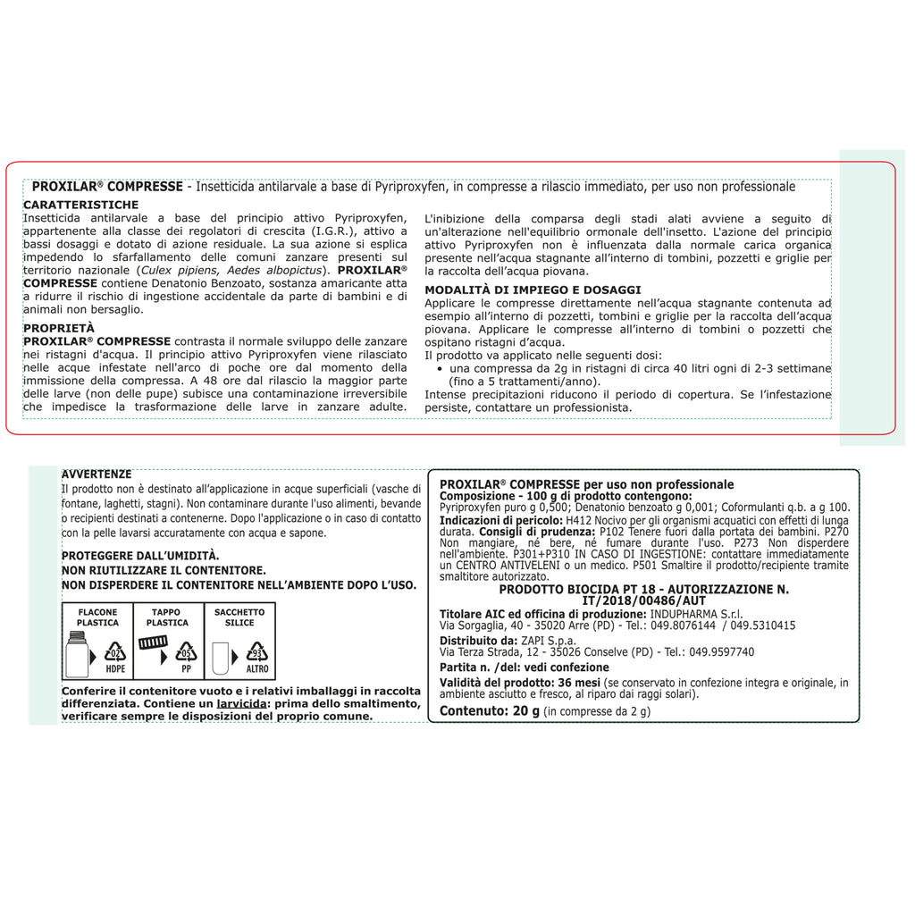 Insetticida antilarvale in barattolo da 10 compresse a base del principio attivo pyriproxyfen, appartenente alla classe dei regolatori di crescita (i.g.r.), attivo a bassi dosaggi e dotato di azione residuale. Attivo per 2-3 settimane. Contrasta il normale sviluppo delle zanzare nei ristagni d’acqua. Il principio attivo viene rilasciato nelle acque infestate nell’arco di poche ore dal momento dell’immissione della compressa e non e' influenzato dalla normale carica organica presente nell’acqua stagnante all