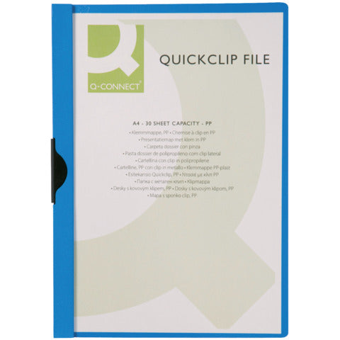 Cartellina con clip realizzata in robusto PVC. Capacità 30 fogli formato A4. Fronte trasparente e retro colorato, clip in metallo nero. Colore: blu.