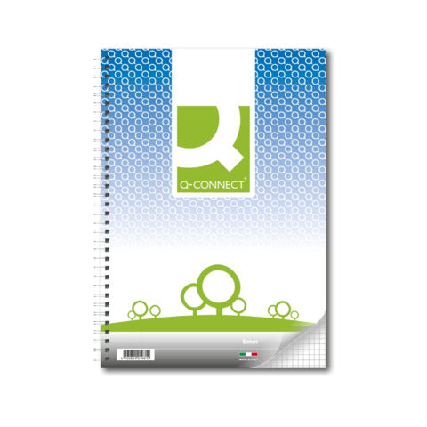 Quaderno spiralato, 80 fogli microperforati. Rigatura quadri 5 mm. In materiale plastico parzialmente riciclato.
