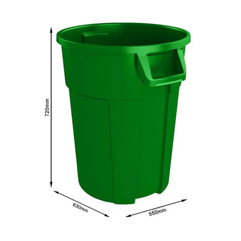 Pattumiera TITAN da 120 LT con coperchio per raccolta differenziata. Ideale anche per uso esterno, molto robusta e resistente. Prodotto dotato di maniglie superiori per facilitare spostamento e manovra e di maniglie inferiori a scomparsa per agevolare sollevamento e spostamenti. Facile da pulire, lavare e disinfettare. Colore verde. Dimensioni: 550 x 630 x 720 m.