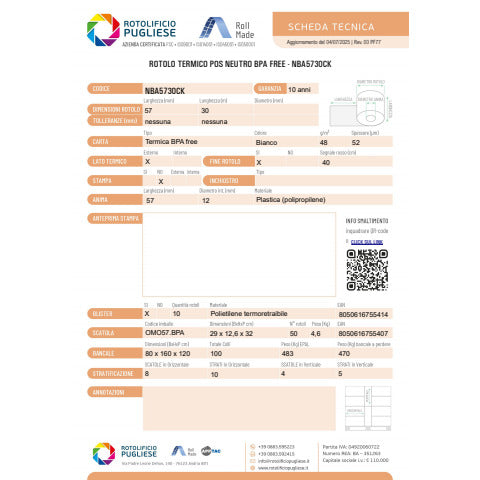 La qualità della carta termica utilizzata, appositamente selezionata, assicura una perfetta stabilità delle scritte e la durata secondo la normativa vigente. Garantiti e certificati, senza stampa, per calcolatrice e POS, sono confezionati in termoretraibile da 10 rotoli. Carta termica BPA Free.