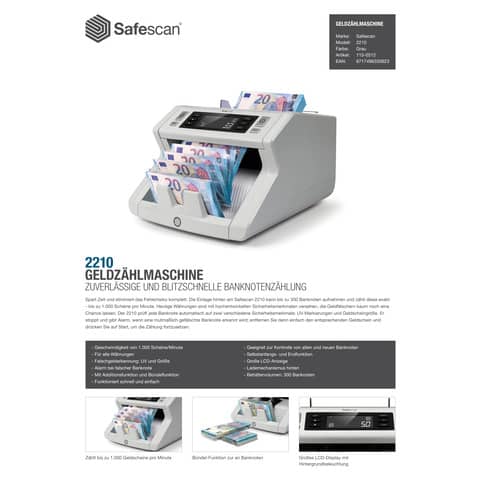 Risparmiate tempo ed eliminate tutte le possibilità di errore. Il contabanconote automatico di Safescan UV 2210 G2 può contenere fino a 300 banconote, conteggiandole in modo preciso e ad una velocità massima di 1.000 al minuto. Le valute odierne vengono stampate con caratteristiche di sicurezza sofisticate che rendono difficile la possibilità di falsificazione. Safescan UV 2210 G2 controlla automaticamente due caratteristiche di sicurezza distinte per ciascuna banconota: i contrassegni UV e le dimensioni della banconota. Quando trova una banconota sospetta, il dispositivo entra in pausa ed emette un segnale acustico di avviso. Quindi è sufficiente rimuovere la banconota contraffatta e riprendere il conteggio.Caratteristiche: conta 1.000 banconote/minuto, contenitore: 300 banconote, capacità cassetto: 220 banconote. Funzioni di avvio automatico e manuale e di aggiunta e batch. Controlli anti contraffazioni: UV e dimensione. Allarme per banconote sospette con segnalazione visiva e audio. Adatto a tutte le valute.
