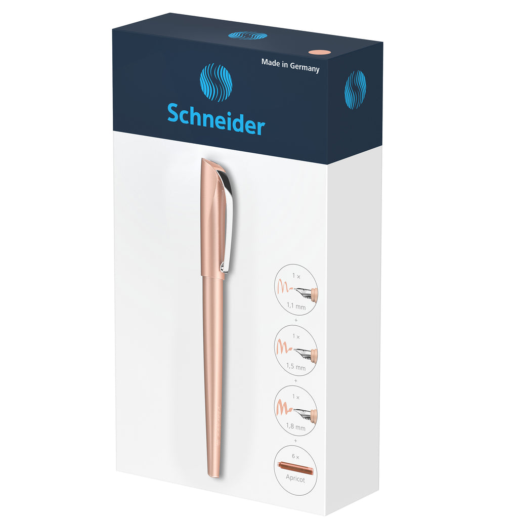 Penna stilografica calligrafica con elegante look metalizzato, impugnatura ergonomica gommata. Utilizzabile con cartucce standard o converter. Confezione regalo contenente: 1 stilo con 3 punte intercambiabili (1,1 - 1,5 - 1,8mm). Incluso nella confezione 6 cartucce ricambio.