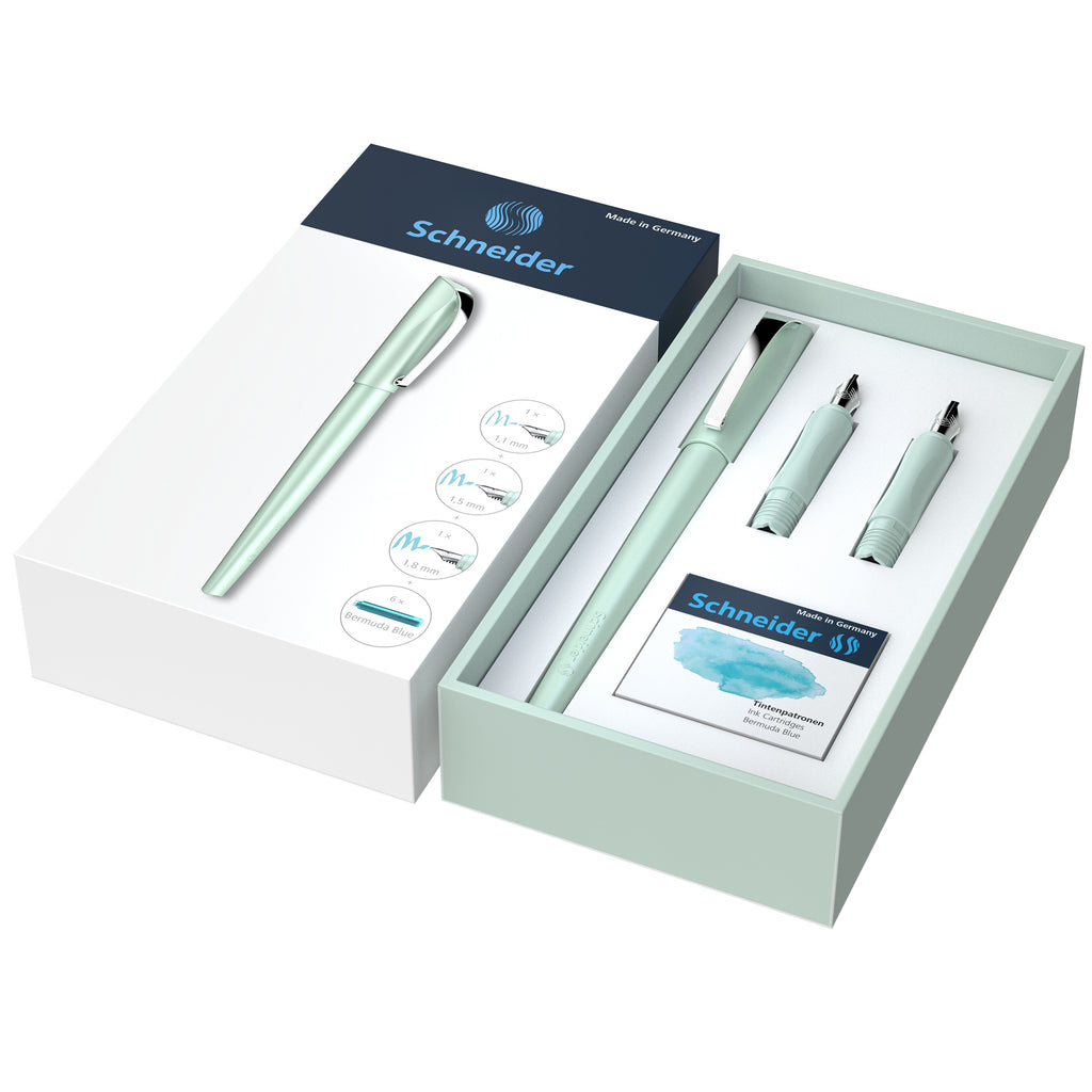Penna stilografica calligrafica con elegante look metalizzato, impugnatura ergonomica gommata. Utilizzabile con cartucce standard o converter. Confezione regalo contenente: 1 stilo con 3 punte intercambiabili (1,1 - 1,5 - 1,8mm). Incluso nella confezione 6 cartucce ricambio.