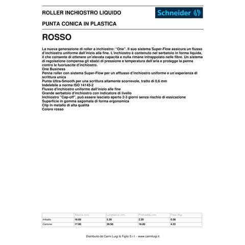 La nuova generazione di roller a inchiostro: “One”. Il suo sistema Super-Flow assicura un flusso d’inchiostro uniforme dall’inizio alla fine. L’inchiostro è contenuto nel serbatoio in forma liquida, il che consente di ottenere un’elevata capacità e nulla rimane intrappolato nelle fibre. Un sistema di regolazione compensa gli sbalzi di pressione e temperatura dell’aria e protegge la penna contro le fuoriuscite d’inchiostro. One Business, Penna roller con sistema Super-Flow per un afflusso d’inchiostro uniforme e un’esperienza di scrittura unica. Punta Ultra-Smooth per una scrittura altamente scorrevole, tratto di 0,6 mmIndelebile a norma ISO 14145-2. Flusso d'inchiostro uniforme dall'inizio alle fine Grande serbatoio d'inchiostro con indicatore di livello Inchiostro ''Cap-off'', può essere lasciato aperto 2-3 giorni senza rischio di essicazione Superficie in gomma sagomata di forma ergonomica Clip in metallo di alta qualità. Colore rosso