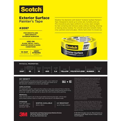 Scotch® Nastro di mascheratura per esterni. Un innovativo nastro isolante resistente alle intemperie per vetro, vinile, metallo e legno verniciato. Progettato per superfici esterne e resiste agli elementi (vento, pioggia, umidità e sole). Conforme alle curve, lacrime diritte. Resistente ai raggi UV. Rimozione pulita per un massimo di 10 giorni. Formato 36 mm x 41 m, colore giallo.