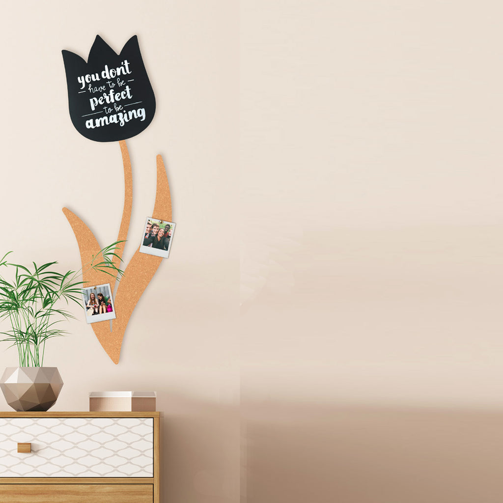 Mix di lavagna in sughero e nera a forma di tulipano. Scrivibile nella parte nera, utilizzabile con le puntine nella parte sughero. Fornita con puntine, marcatore bianco e biadesivi per il fissaggio a parete. Dimensione: 82,5x29cm
