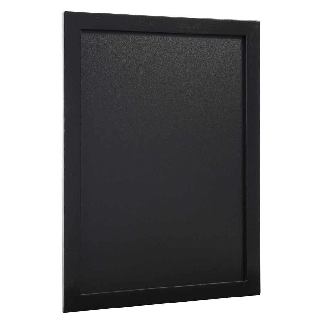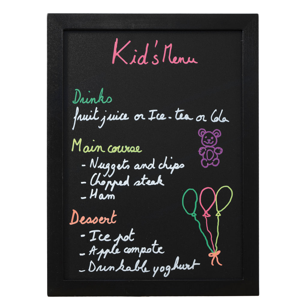 Lavagna di qualita' con cornice in legno laccato nero l2cm h1cm. Fondo lavagna nera in resina melaminica da 4mm. Adatta per uso interno.superficie di scrittura doppia, non porosa, antigraffio, antiuro e resistente ai raggio uv. Fornita con kit di montaggio a parete e 1 pennarello a gesso liquido bianco.