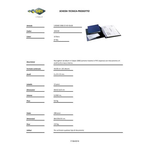 Raccoglitore in colpan 2000 (cartone rivestito in pvc espanso), spessore 1 mm, con meccanismo a 4 anelli (a d) e tasca interna trasparente. Adatto a contenere documenti, disegni, poster, cartine geografiche, cartelli pubblicitari, stampe. Destinato a durare nel tempo. Formato esterno: 480x315 mm. Formato contenuto: 420x300 mm (a3 album, anelli sul lato corto). Dorso: 40 mm. Diametro anelli: 25 mm. Colore blu.