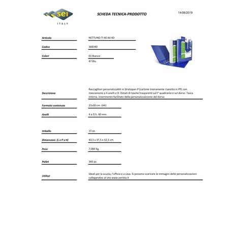 Raccoglitore personalizzabile in Stratopan (cartone interamente rivestito in PP) con tasche trasparenti sul primo quadrante e sul dorso. Meccanismo 4 anelli a D di diametro 40 mm. Tasca interna. Inserimento facilitato della personalizzazione del dorso. Formato esterno 28x32 cm. Formato contenuto 22x30 cm (A4). Larghezza del dorso 5,5 cm. Colore: bianco.Blu